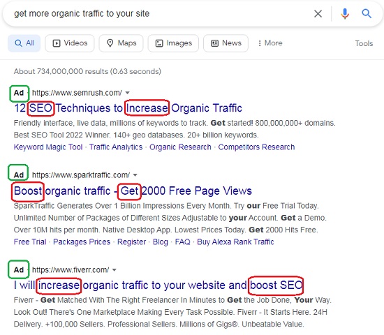 In my case, I noticed that most of the Google ads for the keyword “increase sit traffic” used the words “get more organic traffic to your site”. I also noticed that these same Google ads used terms like SEO, increase, get and boost. Once I got an idea of which words and phrases tended to show up in Google ads.
